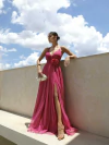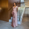 Vestido Longo Luxo em Cetim com Fenda e Detalhe em Rosa Elegância Atemporal