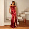 Vestido Longo Luxo Cetim Ombro a Ombro com Fenda Drapeado Elegante no Busto